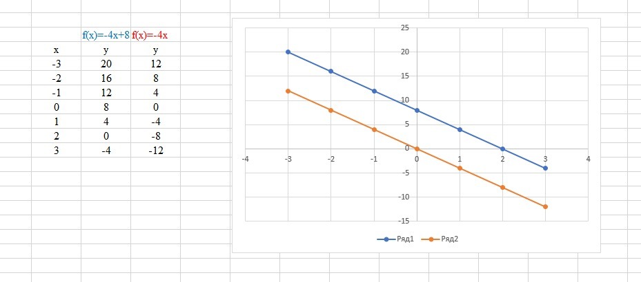 Пожалуйста помогите решить.Построить график функции y=-4x+8. А.Координаты точек пересечения графика с осями координат Б. Значения y,соответствующее значению аргумента,равному 0;1;2;3 В. Значение аргумента,соответствующее значению y,равному 0;4;8 Г. Возрастает или убывает заданная линейная функция Д. Построить график пароллельный данному,проходящий через начало координат (0;0) Е. Геометрический смысл коэффициентов K и b.Заранее спасибо