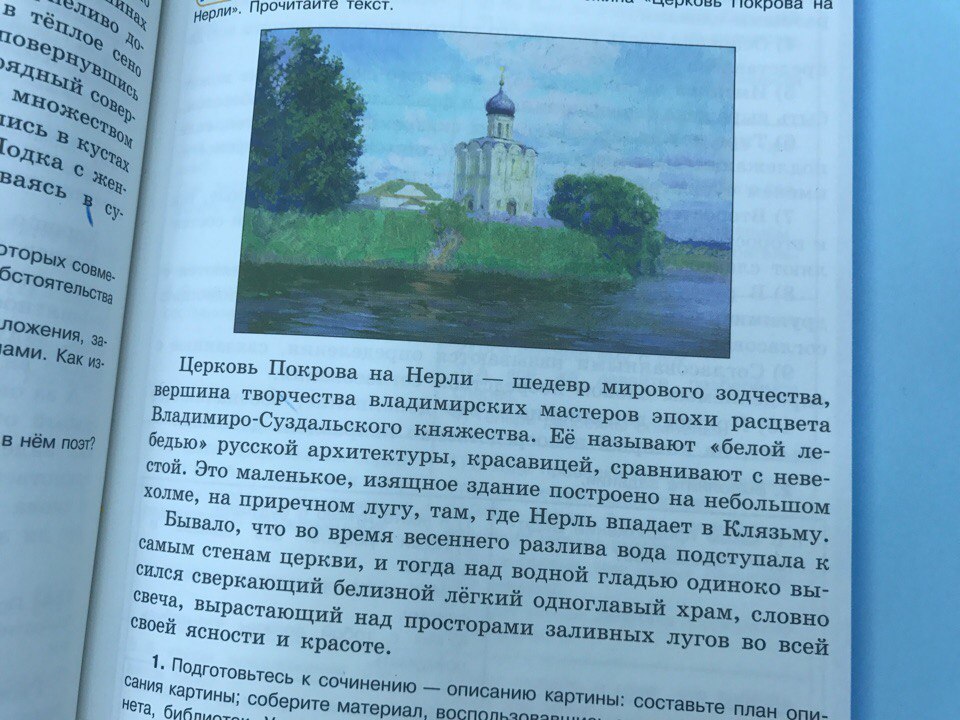 На картине хорошо показано, как среди светло-зелёной травы ярко выделяется синяя река, которая отражает белокурые, пушисто-белоснежные облака. Они очаровывают своей формой и беспорядочностью. Пушистые и могучие деревья, которые стоят возле церкви такие же высокие, как и она, что даже у неё увенчанный крест главка растворяется в воздухе и где-то высоко тает в небе. Церковь стоит на берегу холма, который окутывается рекой Нерль. Этот собор отлично выделяется в этой картине, поскольку церковь находится на середине картины и берёт всё внимание на себя. Храм белокаменный, с изящными формами и фиолетовыми куполами, но здесь они золотые, потому что отражают яркие лучи солнца.