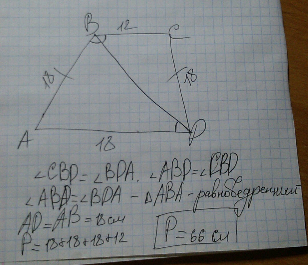 СРОЧНО!!!! основы ровнобочной трапеции равны 12 и 18 см,а диагональ является бесиктрисой ее тупого угола. Найти периметр трапеции.