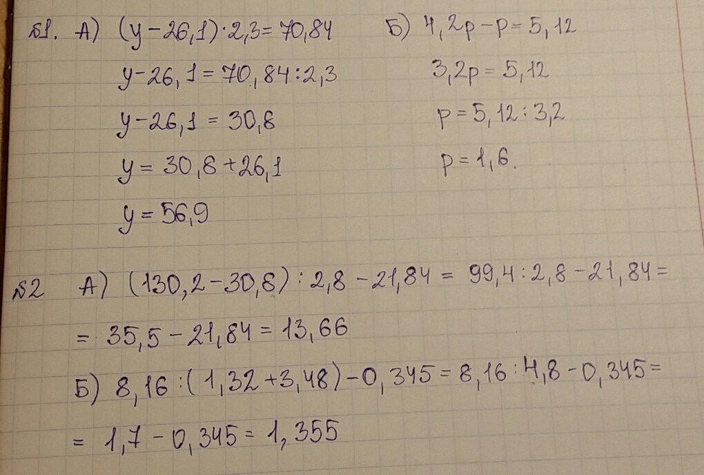 №1 Решить уравнения: а) (у-26,1)*2,3=70,84; б)4,2р-р=5,12
