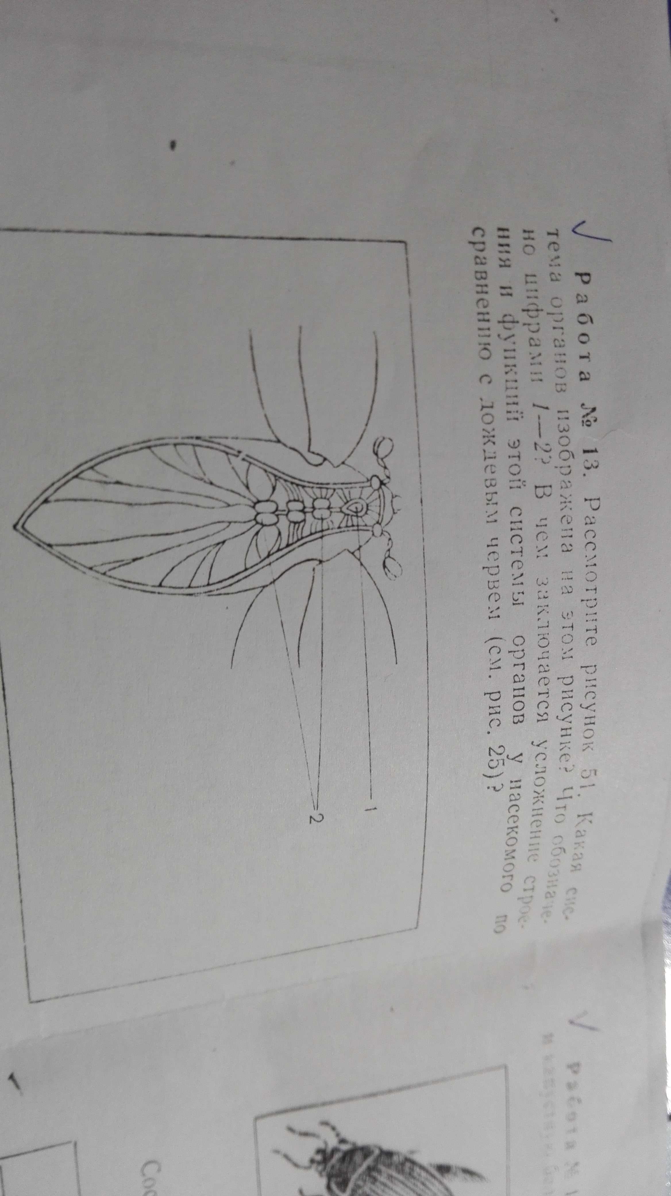 Рассмотрите рисунок. Какая система органов изображена на этом рисунке? Что обозначено цифрами 1-2? В чем заключается усложнение строения и функций этой системы органов у насекомого по сравнению с дождевым червем?