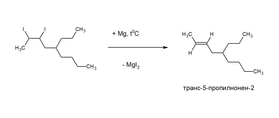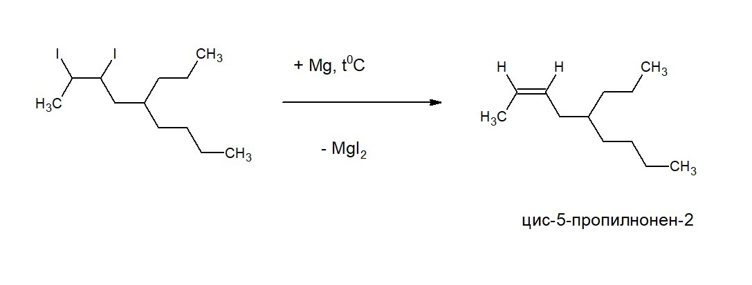 Реакция дегалогенирования вицинальных (атомы галогена у соседних атомов углерода) дигалогеналканов.