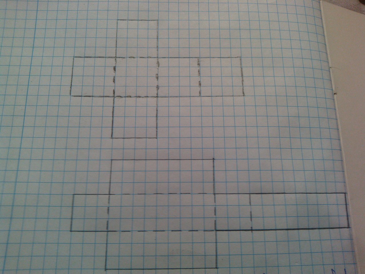 Я так понимаю, что под прямоугольником вы имели в виду параллелепипед, потому что в развернутом виде можно нарисовать только объёмные фигуры, а прямоугольник сам по себе плоский. Предлагаю такой вариант, пунктиром изображены линии сгиба.