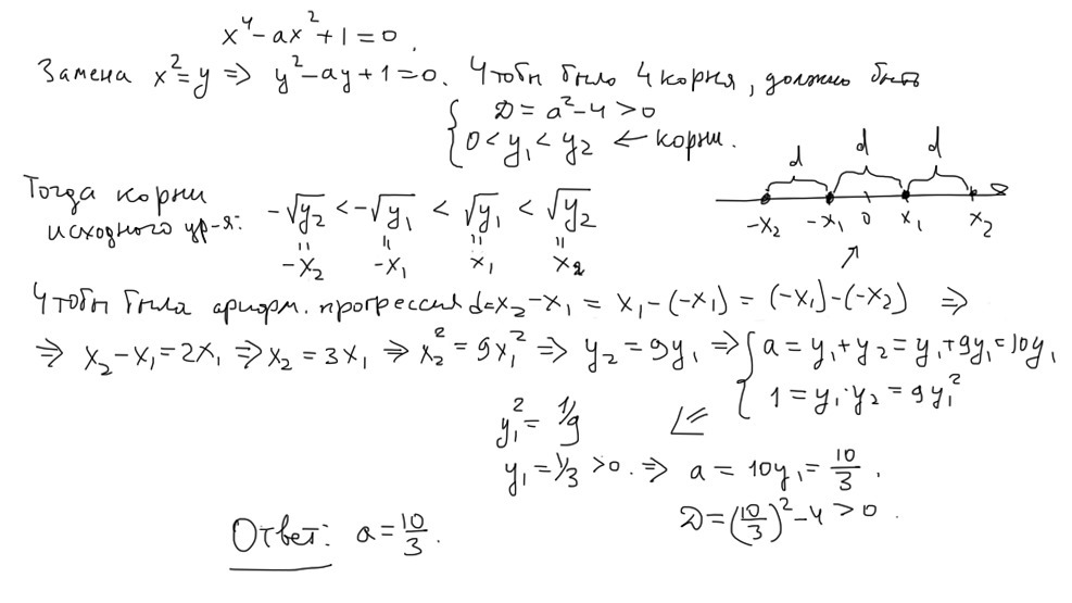 Дам 40 балов за лучшее объяснение!! Найдите все значения для параметра а, при которых уравнение х^4-ax^2+1=0 имеет 4 корня, образующих арифметическую прогрессию.