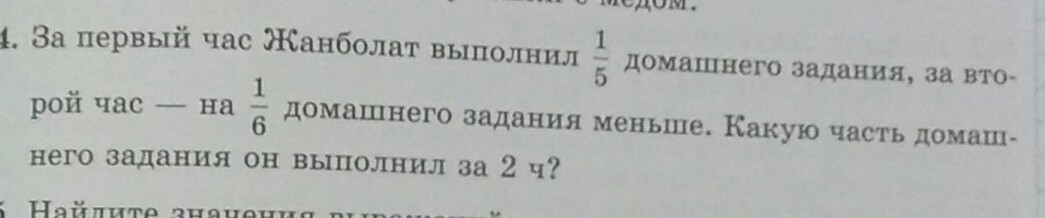 Тут две дроби с разными знаметателями. Прежде чем совершать с ними действия надо сначала их привести к общему знаметателю, вот так как на первом фото. И затем вычислить сколько выполнил домашнего задания за второй час, как на втором фото. Ну и в последнюю очередь вычислить сколько выполнил домашнего задания за 2 часа, как на третьем фото.