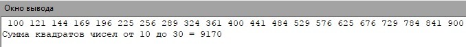 writeln('Сумма квадратов чисел от 10 до 30 = ', sumSqr);