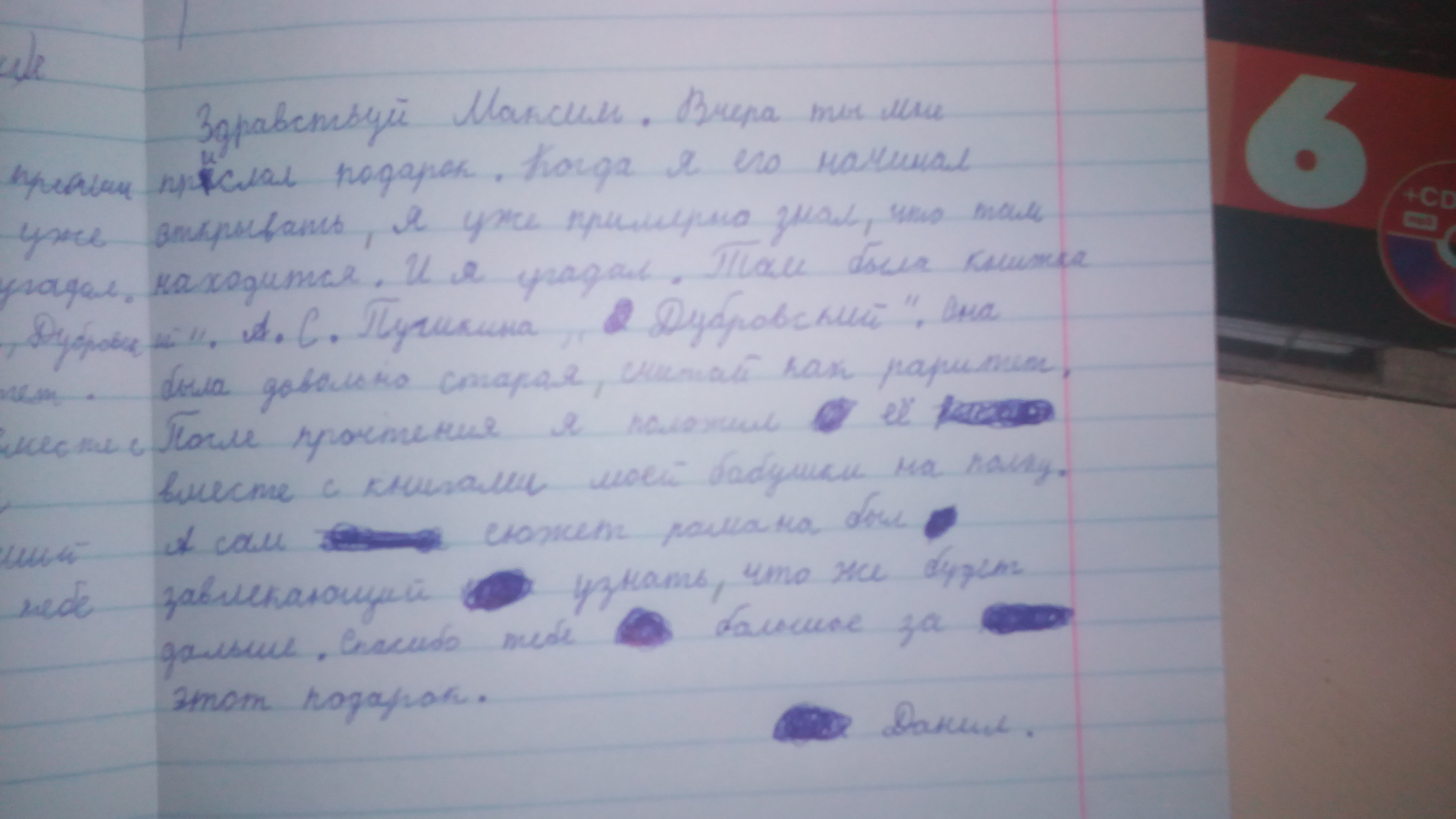 Здравствуй,Максим (запятая,т.к. обращение). Вчера ты мне прислал подарок. Когда я начал его открывать,я примерно знал,что там находится. И угадал. Там была книга А.С.Пушкина "Дубровский",она была довольно старая,можно даже назвать ее раритетом. После прочтения я положил книгу на полку к остальным книжкам моей бабушки. Сам сюжет романа был очень увлекательный. Мне не терпелось узнать,что же будет дальше. Спасибо тебе большое за этот подарок.