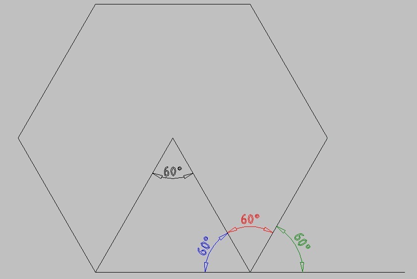 Угол от такого же соседнего треугольника (красный) тоже равен 60 градусам