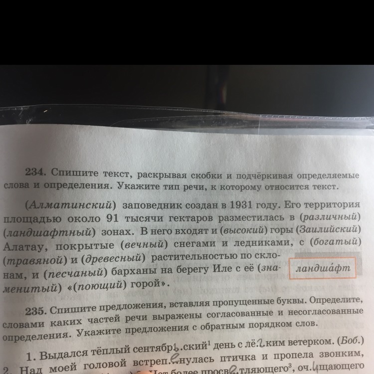 Спишите текст, раскрывая скобки и подчёркивая определямые слова и определения. Укажите тип речи, к которому относится текст.