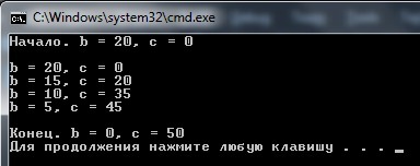 Следующий блок открывает цикл с условием, пока b (20) > 3, выполнять блок, который увеличивает значение переменной c = c + b и b = b - 5.