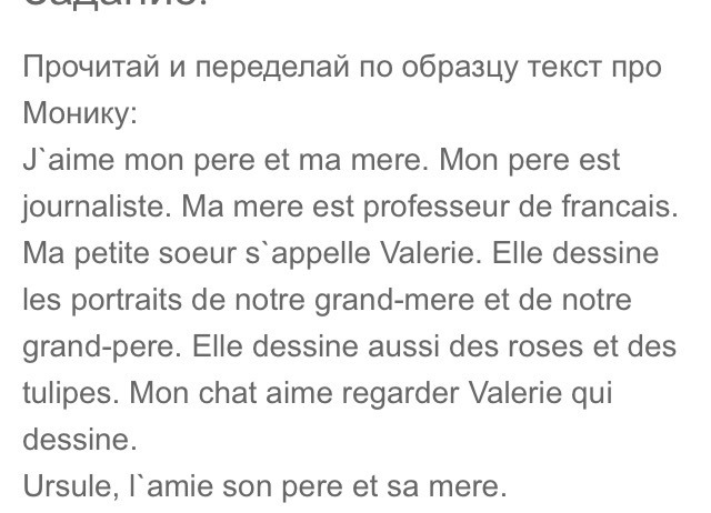 J’appele Monika j’ai ma famille c’est mon pere ma soeur,ma mere et ma chat j’aime ma famille.Ma soeur s’applle Valerie,Elle j’ame dessiner j’aime comment elle dessiner et mon chat,il regarde Elle dessin heures.
