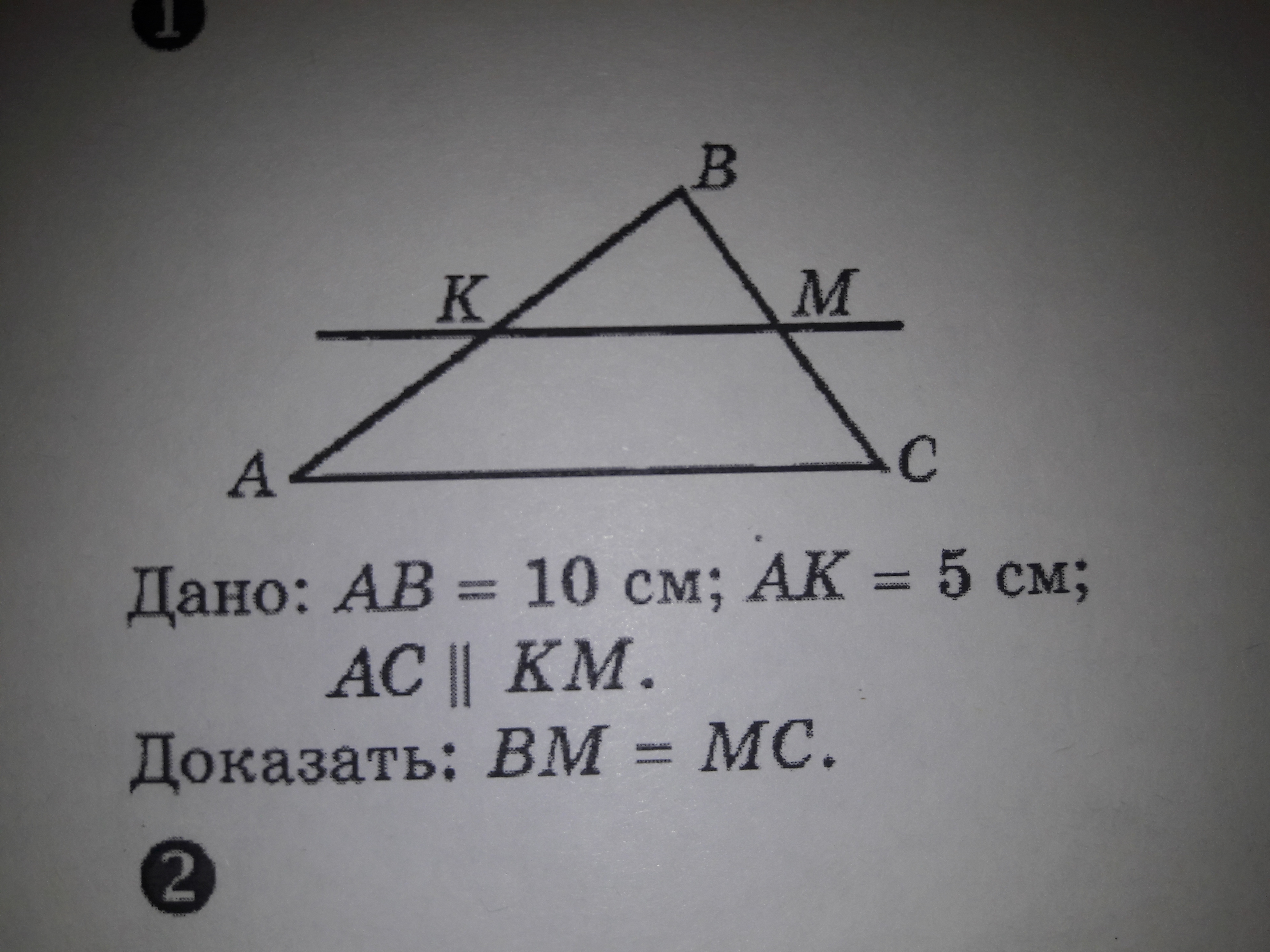 КВ=АВ-АК=10-5=5см. Если КВ=АК, и АС||КМ, значит КМ-средняя линия треугольника. Средняя линия треугольника делит стороны АВ и ВС на пополам. Из этого выходит, что половина ВС-ВМ=половине ВС-МС...