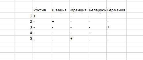 5) Белорусы будут четвертыми, а первое место займет Г ермания. После подведения итогов выяснилось, что в каждом предположении часть утверждения - истинна, а часть - ложна. В каком порядке финишировали команды? В ответе перечислите первые буквы названий стран без пробелов и запятых (начиная с первого места и заканчивая пятым).