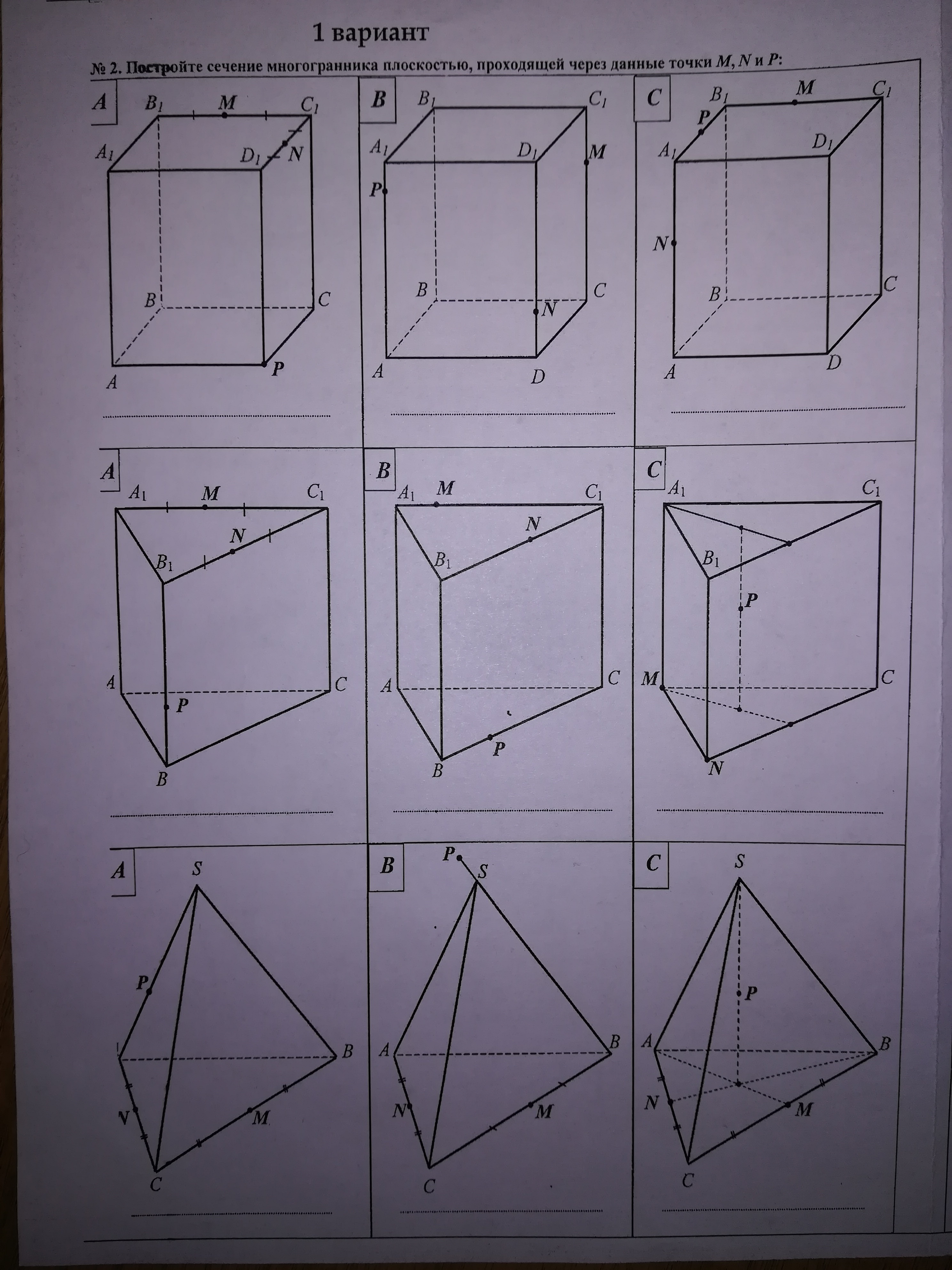 1 вариант геометрии 10 класс Постройте сечение многогранника плоскость, проходящей через данные точки M, N и P