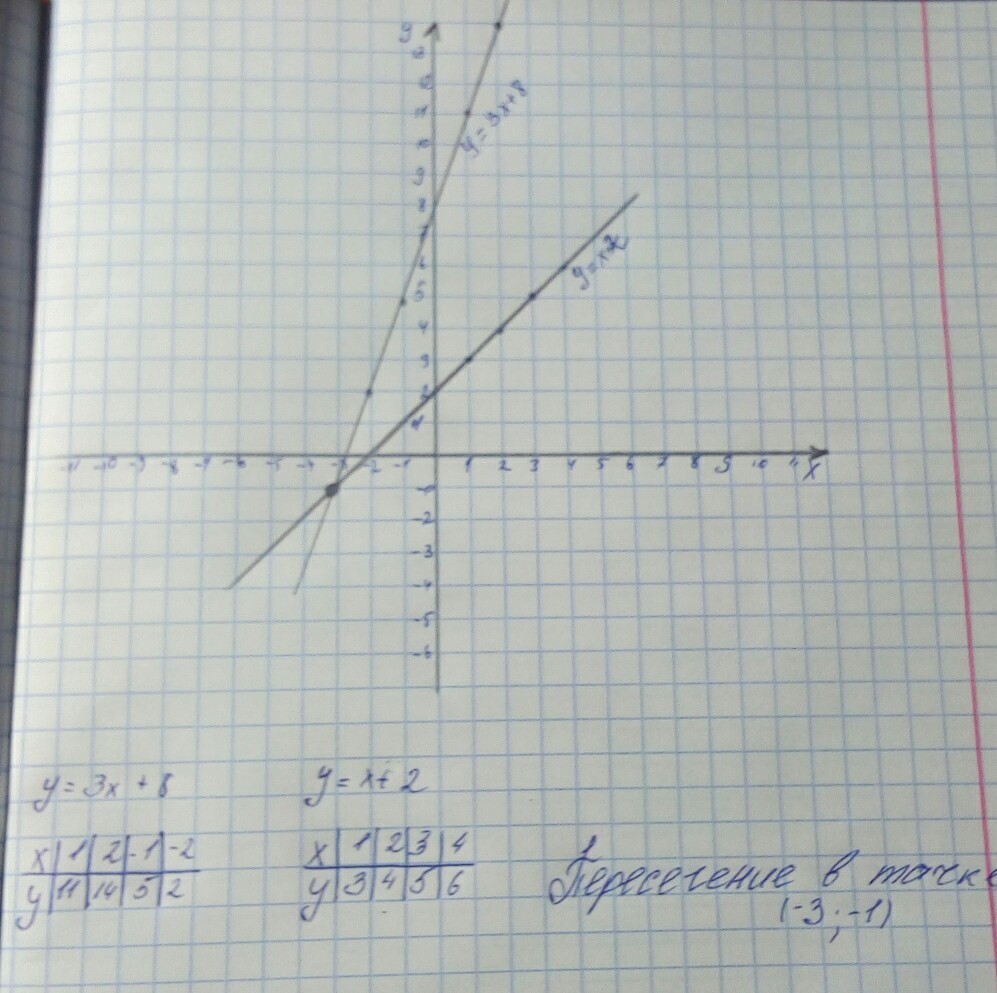 Х+2=3х+8; -2х=6; х=-3; тогда у=-3+2=-1. (-3;-1)это координаты точки пересечения первой пары прямых. И две следующие прямые : 2х=х-4; х=-4; у=2*(-4)=-8; (-4;-8) это координаты точки пересечения второй пары прямых