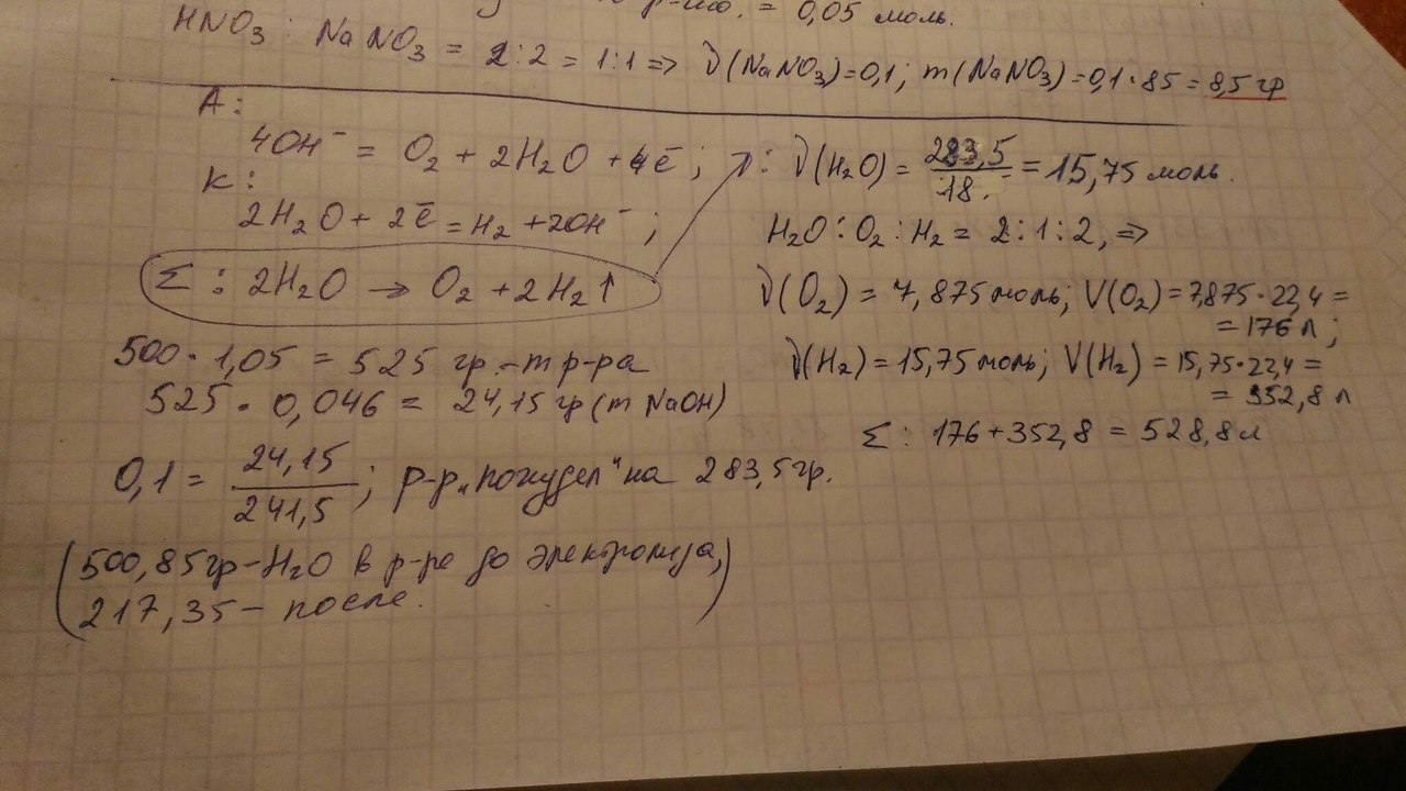 Через электролизер, содержащий 500 мл раствора гидроксида натрия с массовой долей 4,6% и плотностью 1,05 г/мл, пропустили электрический ток. Спустя несколько часов массовая доля гидроксида натрия возросла до 10%. Определите объем газов (н.у.), выделившихся на электродах.