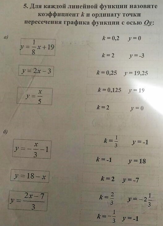 Для каждой линейной функции назовите коэффициент k и ординату точки пересечения графика функции с осью y