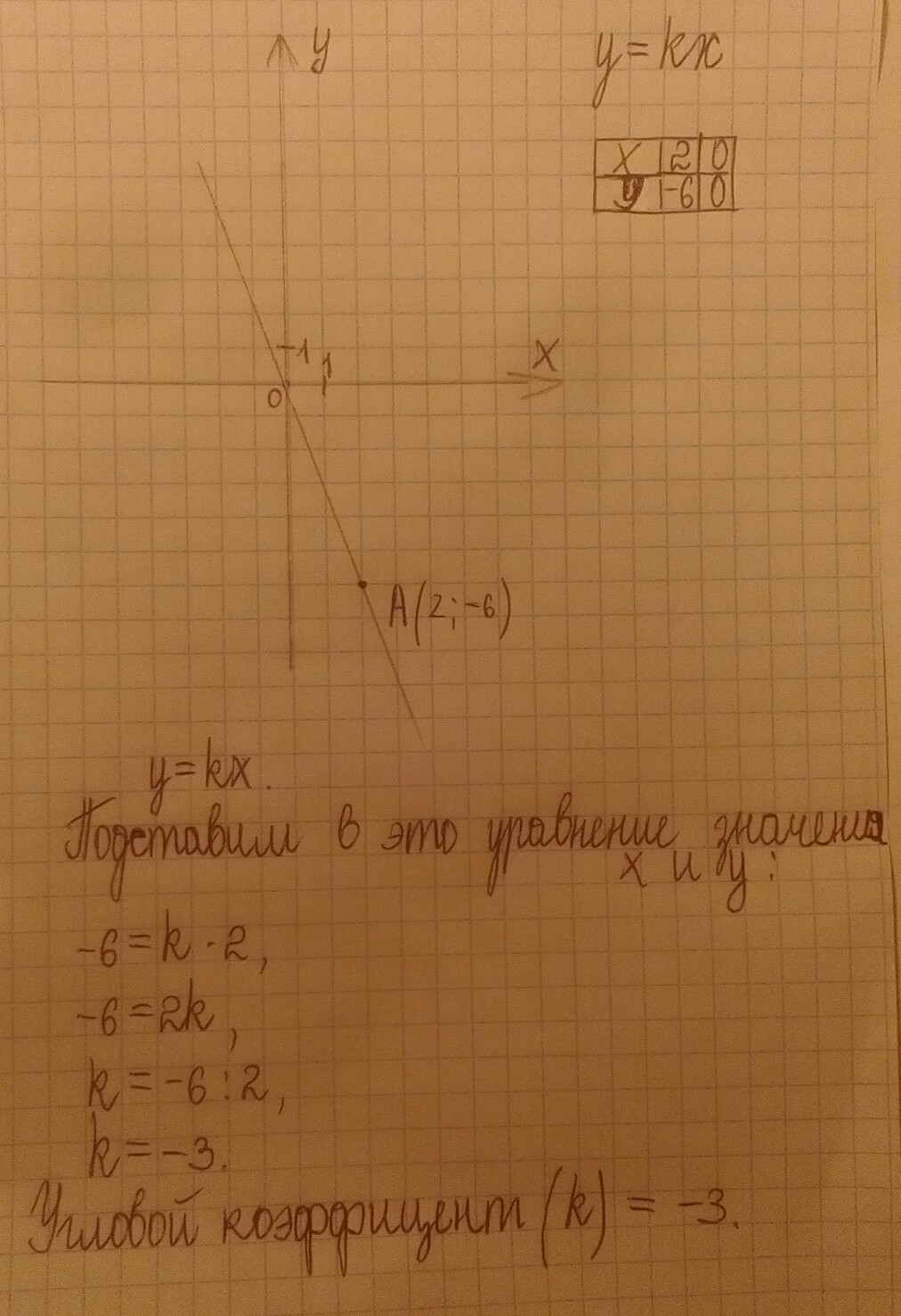 Постройте график зависимости у=kx , если он проходит через точку А(2;-6). Найдите угловой коэффициент k и постройте график этой функции