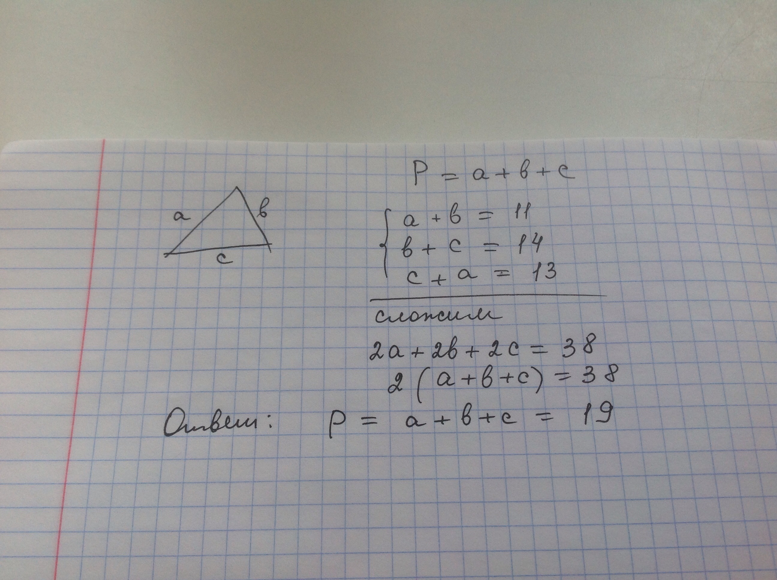 Сумма первой и второй стороны треугольника равна 11 см, второй и третей − 14 см, а третей и первой − 13 см. Найти периметр треугольника.