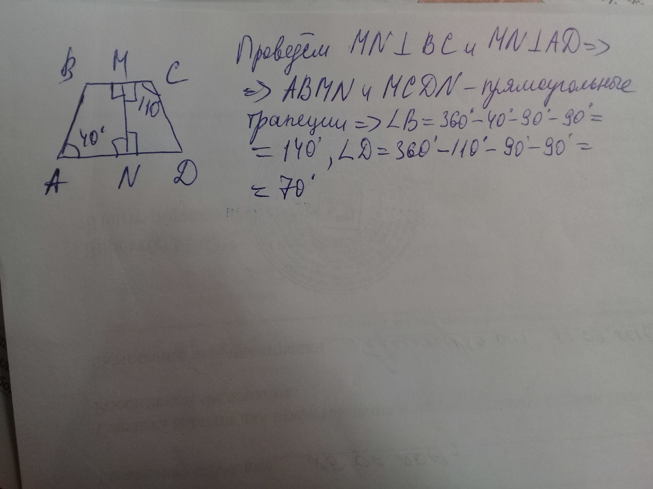 В трапеции АВСД с основаниями АД и ВС угол А равен 40град., а угол С равен 110град.Найдите остальные углы . можно с рисунком пж