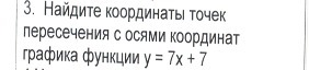 ось абсцисс( y=0): 7x+7=0, 7x= -7, x=(-7)/7= -1. точка А: (-1:0). ось ординат( x=0); y=7*0+7=7. точка В: (0:7).