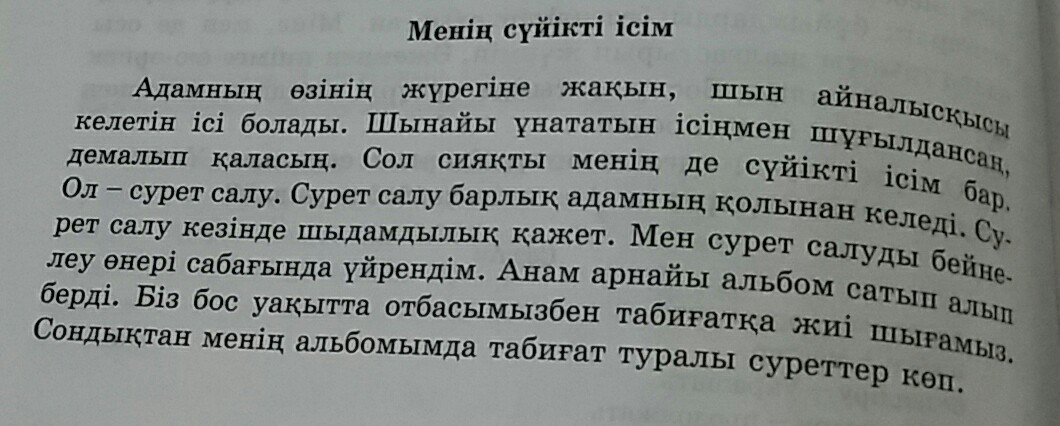 Человек близко к сердцу и хочет быть честным. Когда вы сделаете все возможное, вы сможете расслабиться. Кроме того, у меня есть любимая работа. Это рисунок. Рисование может быть сделано всеми. Выносливость требуется при рисовании. Я изучал живопись в искусстве живописи. Моя мать купила специальный альбом. Мы часто выходим в дикую природу вместе с нашей семьей. Вот почему в моем альбоме много картин о природе.
