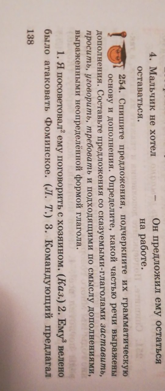 Я(подлежащее) посоветовал (сказуемое) ему (дополнение) поговорить (дополнение) с хозяином (дополнение). Ему дополнение) велено было(сказуемое) атаковать (дополнение) Фоминское (дополнение).