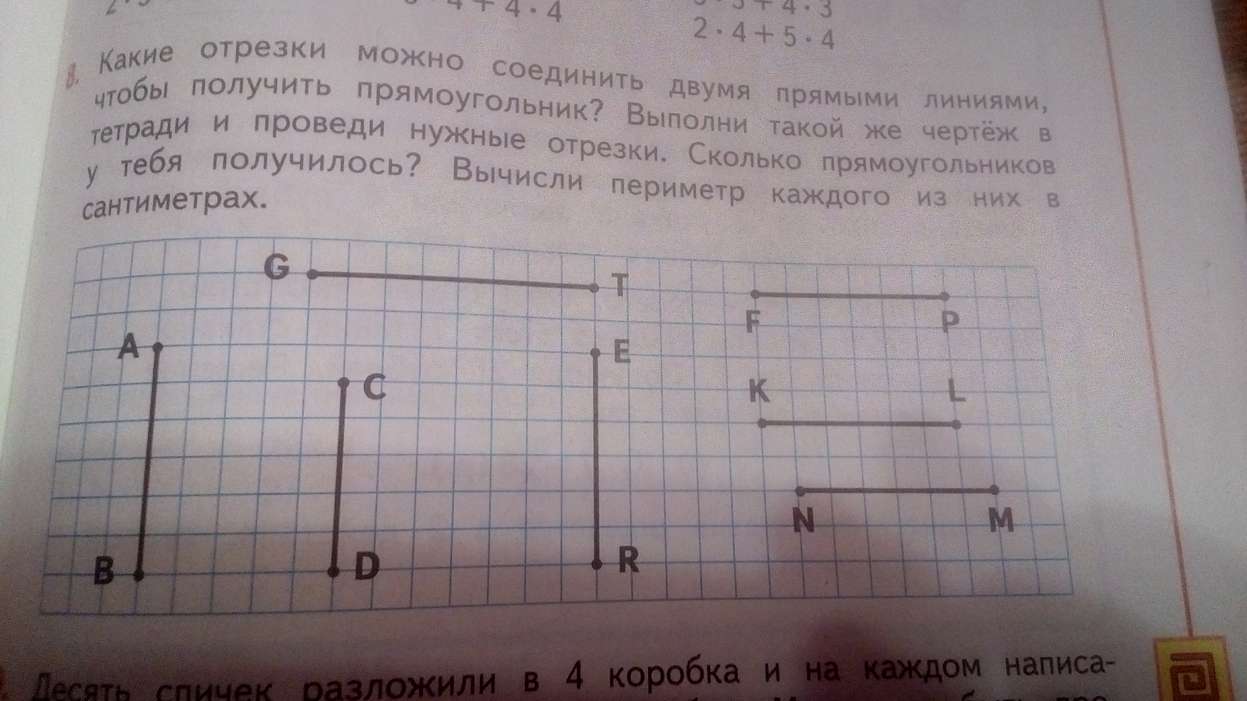 Какие отрезки можно соединить двумя прямыми линиями,чтобы получить прямоугольник?Выполни такой же чертёж в тетради и проведи нужные отрезки. Сколько прямоугольников у тебя получилось.