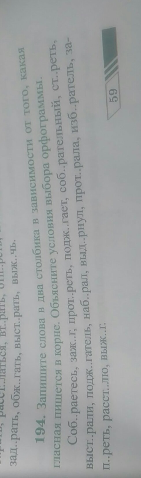 Упр 194. Запишите слова в два столбика в зависимости от того, какая гласная пишется в корне. Объясните условия выбора орфограммы.