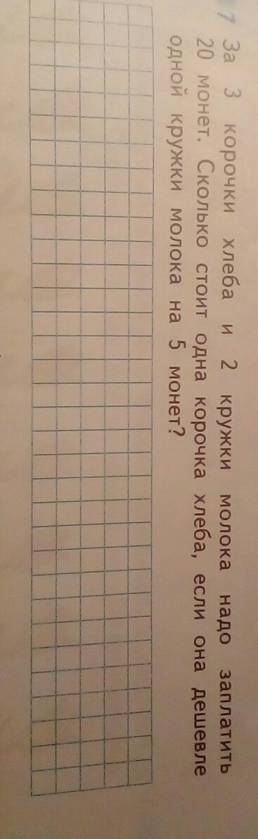 Решите задачу За 3 корочки хлеба и 2 кружки молока надо заплатить 20 монет Сколько стоит одна корочка хлеба если она дешевле одной кружки молока на 5 монет