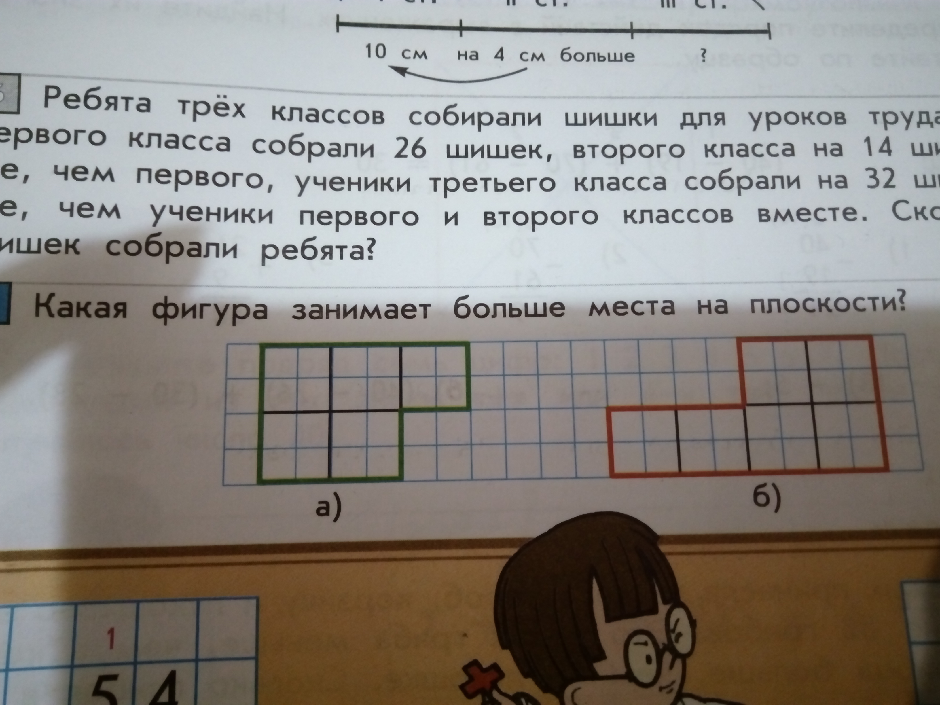 Фигура Б занимает больше места на плоскости, т.к. состоит из 6 больших квадратов, а фигура А состоит из 5 больших квадратов.