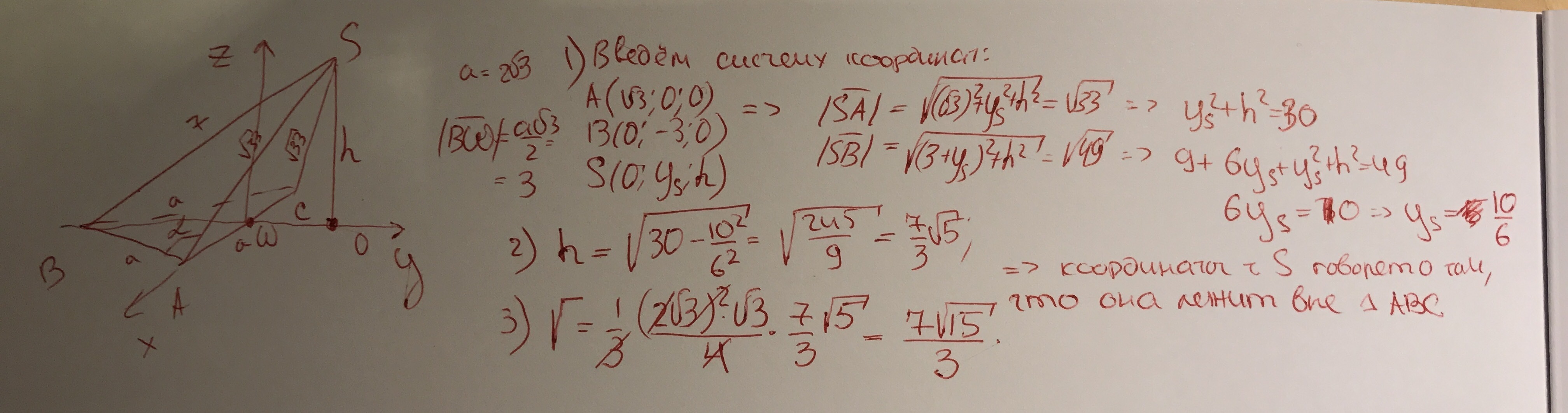 В пирамиде SABC в основании лежит правильный треугольник ABC со стороной 2√3, SA=SC=√33, SB=7. Точка О-основание высоты пирамиды, проведённой из вершины S.