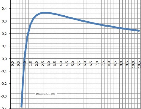 7. Корни при Х1=e. Максимум Ymax= 1/e.