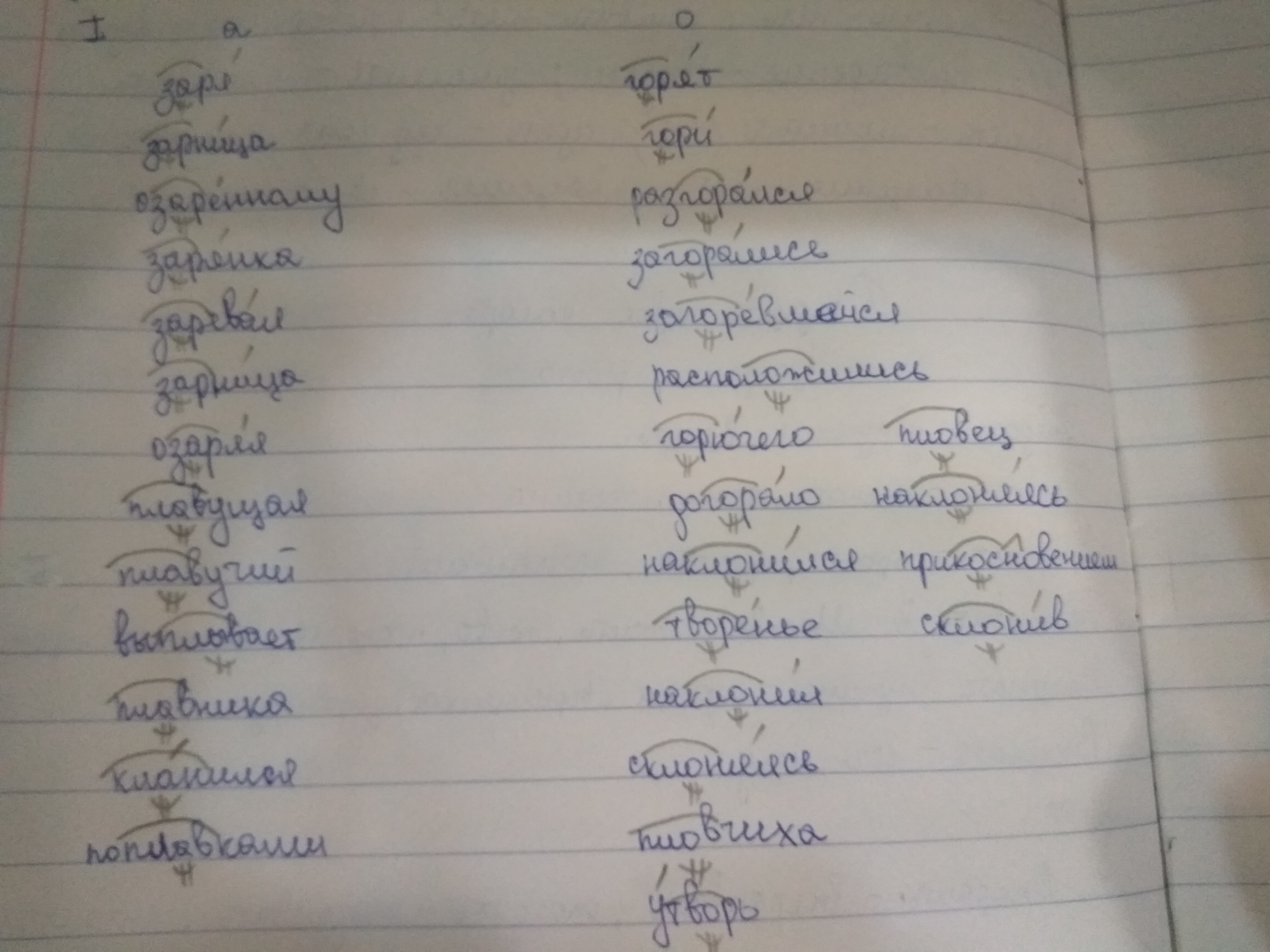 I. 1. И стоит берёза в сонной тишине, и г...рят снежинки в золотом огне. А з...ря, лениво обходя кругом, обсыпает ветки новым серебром. (Ес.) 2. Ты г...ри, моя з...рница. (Ес.) 3. Закат разг..рался пурпуром. (Кор.) 4. Вал за валом катился вдаль к оз...рённому ещё горизонту. (Кор.) 5. В росистой траве заг...рались от солнца красные огоньки земляники. (Аст.) 6. И правда, на голос зорьки-з...рянки ответило сразу несколько голосов — и пошло, пошло! (Аст.) 7. И слава з...ревая облекла вон те пруды. (А. Б.) 8. З...рница начинала ярко блестеть на востоке. (Л. Т.) 9. О, раскрой перед нами узоры мечты, заг..ревшейся в сердце твоём! (Бальм.) 10. Там распол..жились склады продовольствия, боеприпасов и г...рючего. (Бек) 11. Встали зори красные, оз...ряя снег. (А. Б.) 12. В углу, где заг...релось, дог...рало низовым жаром. (Расп.) 13. Просторный, в выг..ревшей траве, двор пустовал. (Шол.)