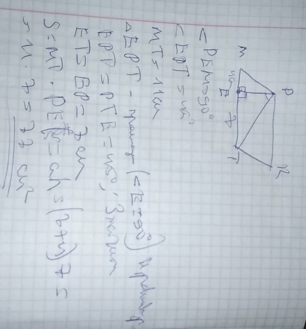 В параллелограмме МРКТ на стороне МТ отмечена точка Е уголРЕМ=90 град. угол ЕРТ=45град. МЕ=4 см ЕТ=7 см. Найдите площадь параллелограмма