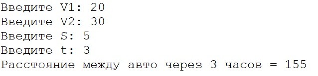 writeln('Расстояние между авто через ',t,' часов = ',V1*t+s+V2*t);