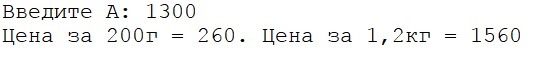writeln('Цена за 200г = ', tmp, '. Цена за 1,2кг = ', A + tmp);