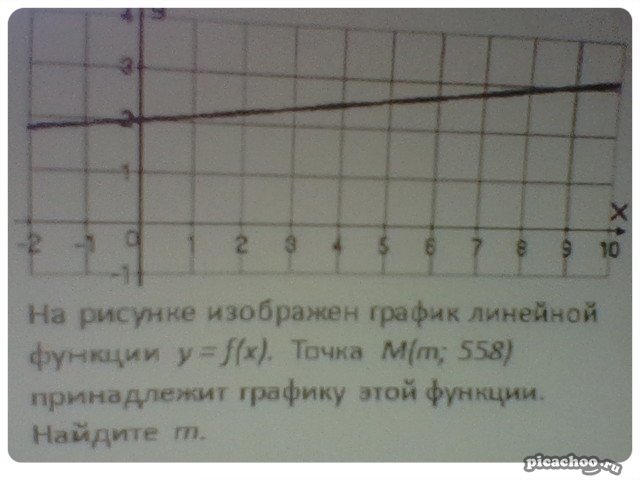 На рисунке изображен график линейной функции y=f(x). Точка M(m; 558)принадлежит графику этой функции. Найдите m.