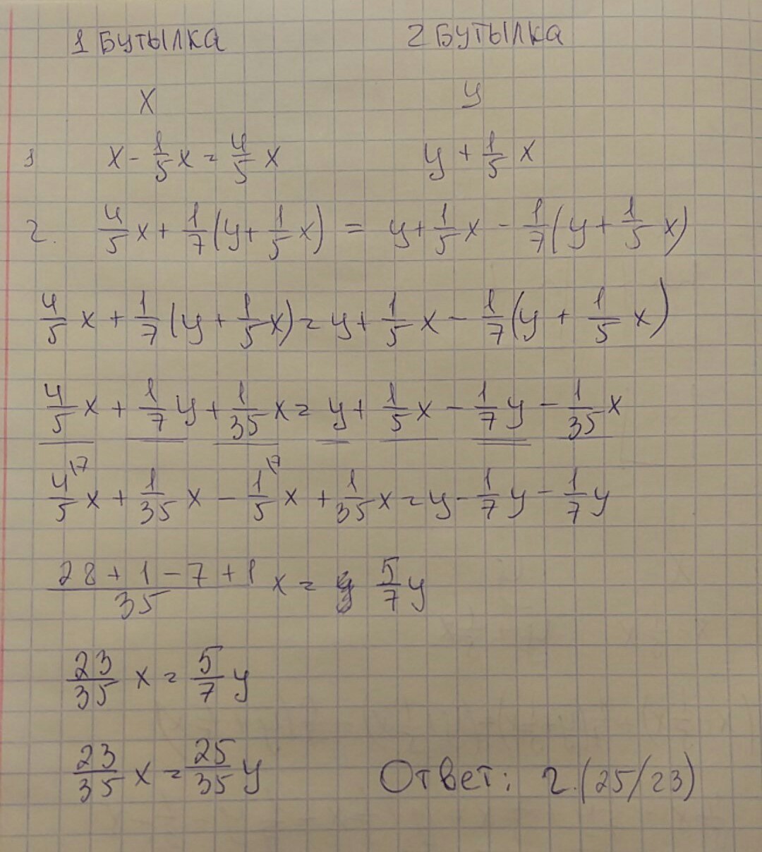 Олимпиада по математике. Две бутылки заполнены некоторым количеством воды. Сначала 1/5 воды из первой бутылки перелили во вторую. А затем 1/7 имеющейся воды из второй перелили в первую. После этих манипуляций количество воды в двух бутылках сравнялось. Найди, во сколько раз больше было воды в первой бутылке, чем во второй до переливания?