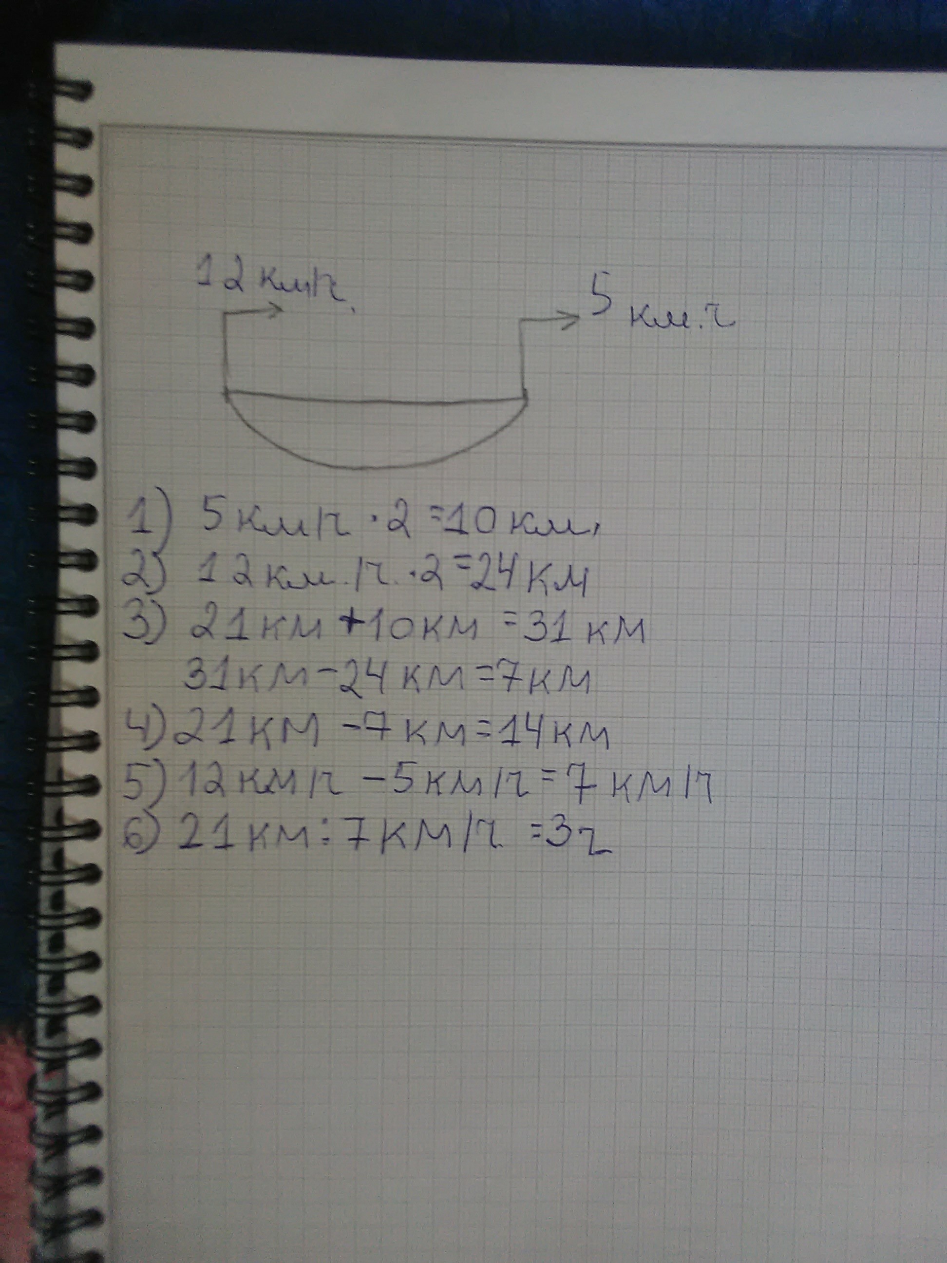 Из пунктов А и В, расстояние между которыми 21 км, отправляются в путь одновременно пешеход из В и вдогонку ему велосипедист из А и движутся со скоростью: пешеход 5 км/ч, велосипедист 12 км/ч. Начертите схему движения. Ответьте на вопросы: