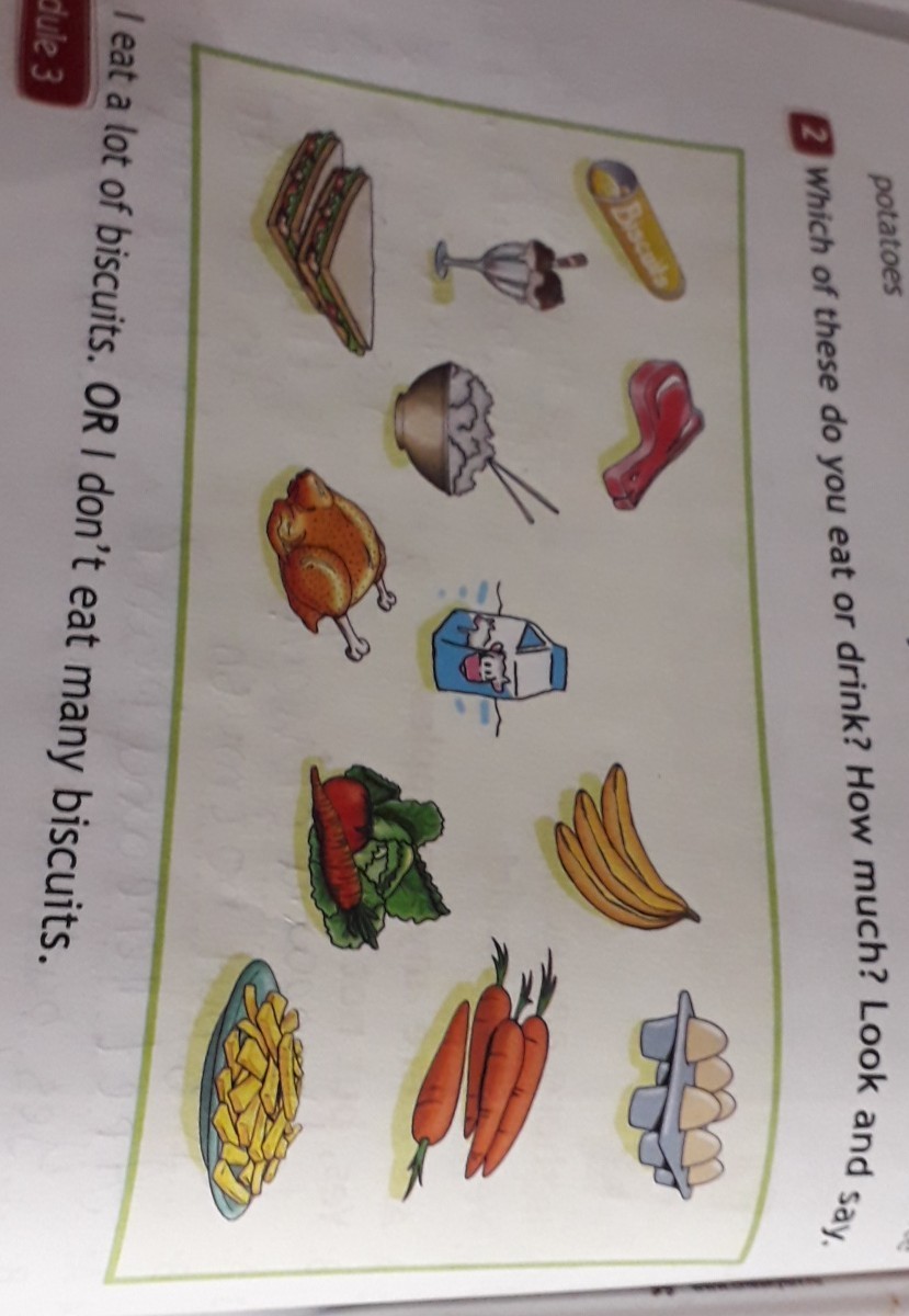 Что из этого ты ешь или пьешь? Как много? Посмотри и скажи.