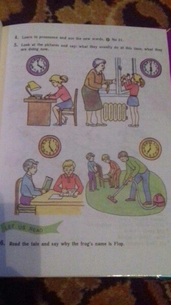 Look at the pictures and say; what they usually do at this time; what they are doing now.