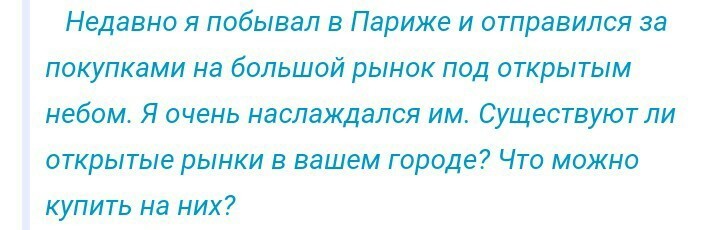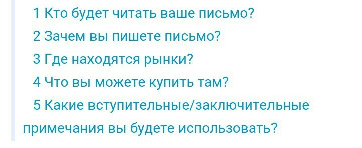 мое письмо будет читать мой друг, который живет в другом городе. Я пишу это письмо чтобы познакомить его с нашим городом, рассказать о его повседневной жизни. рынков в городе очень много, по нескольку в каждом районе города, в основном рядом с жилыми кварталами. на рынках можно купить множество разных вещей от еды и одежды до инструментов и животных. когда я буду писать письмо, я обязательно попрошу своего друга, чтобы он рассказал мне что-нибудь интересное о своем городе.