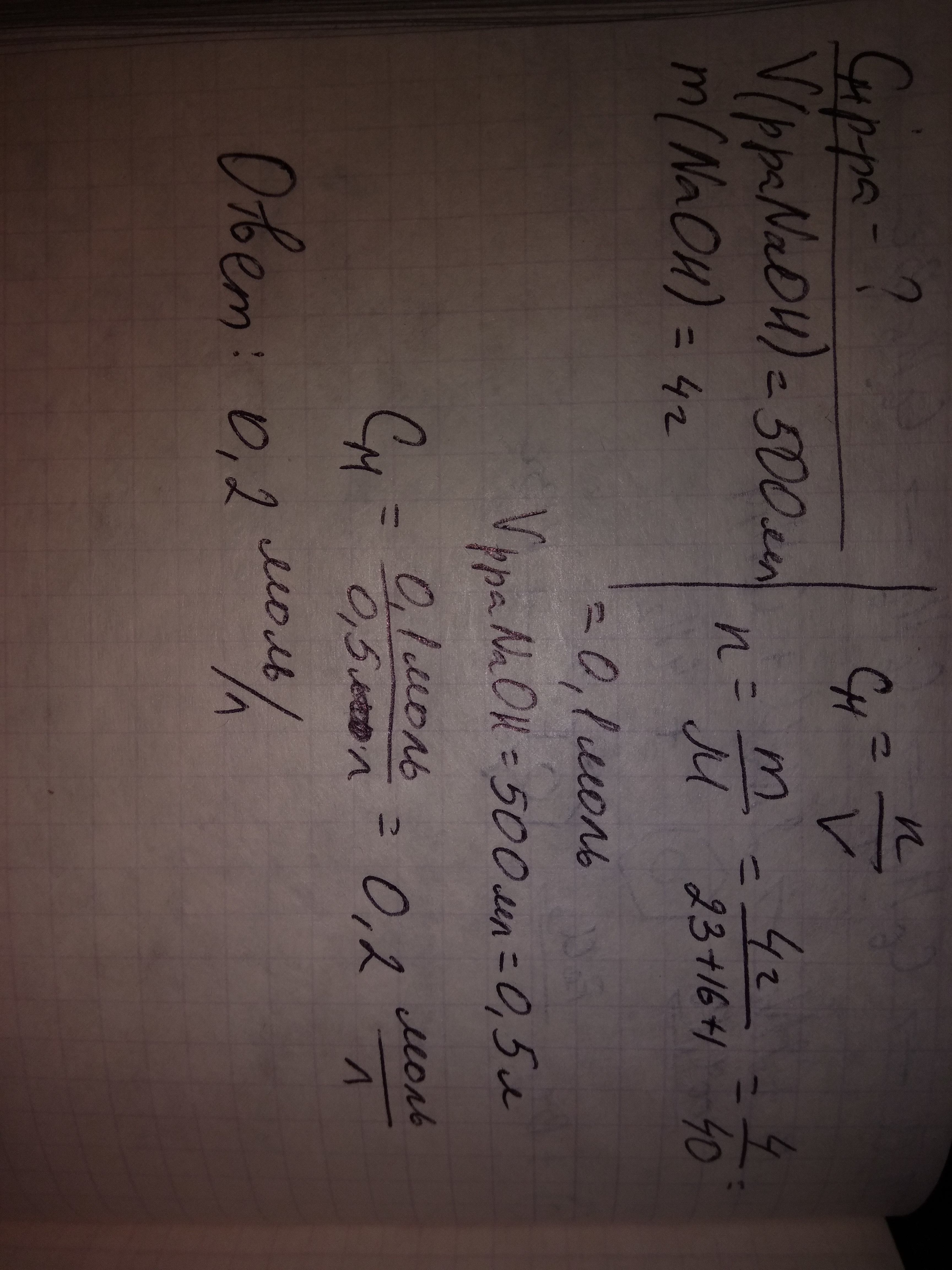 определите молярную концентрацию раствора если в 500 мл данного раствора содержится 4г. гидроксида натрия?