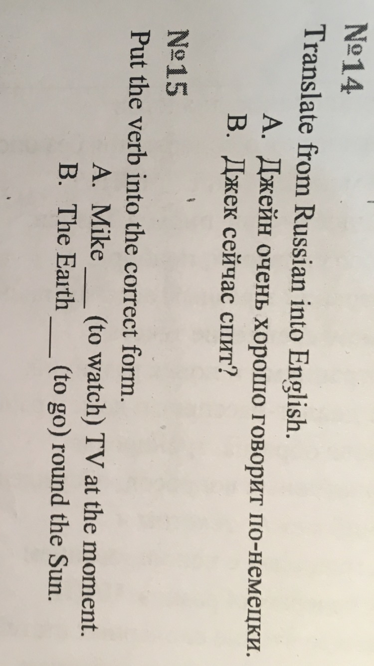 номер 14 А. jake good speaks in the german b. is jake sleeping now номер 15 А. прости но не смогла пожалуйста напиши мне письмо если нужна ещё помощь!