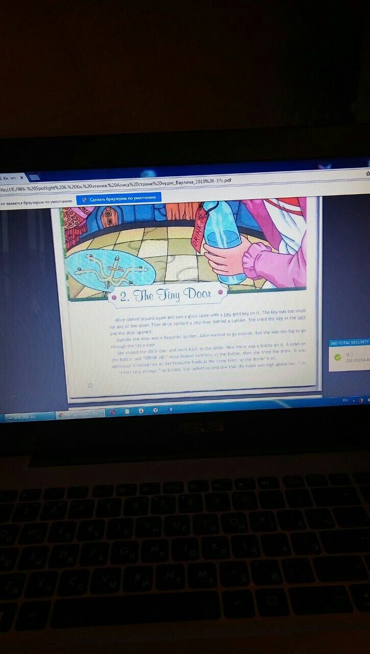 алиса посмотрела вокруг снова и увидела стеклянный стол на котором лежал золотой ключ .Ключ был очень маленький для других дверей (поняла ток это)