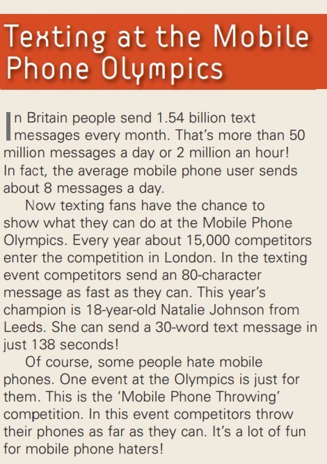 Британские люди получают 1.54 биллиона текстовых сообщений каждый месяц. Что значит 50 миллионов сообщений в день и 2 миллиона в час! Факт, пользователи мобильных телефонов используют , получают около 8 сообщений в день.Сейчас текстовые фанаты имеют шанс учавствовать в олимпиаде мобильных телефонов.Каждый год около 15000 конкурентов входят в соревнования в Лондоне. В тексте конкуренты посылают 80 сообщений на скорость. Этот чемпионат ежегодный 18-лет-старой- Натали Джонсон . Она может получить 30 текстовых сообщений за 138 секунд.Конечно люди ненавидят мобильные телефоны. Это соревнования мобильные телефоны . Каждые соревнования телефоны они могут . Много забавных ненавистников мобильных телефонов. ТЕКСТ ПЕРЕВЕДЁН ДОСЛОВНО , ИСПОЛЬЗОВАНЫ ТОЛЬКО ЗНАНИЯ ПЕРЕВОДА