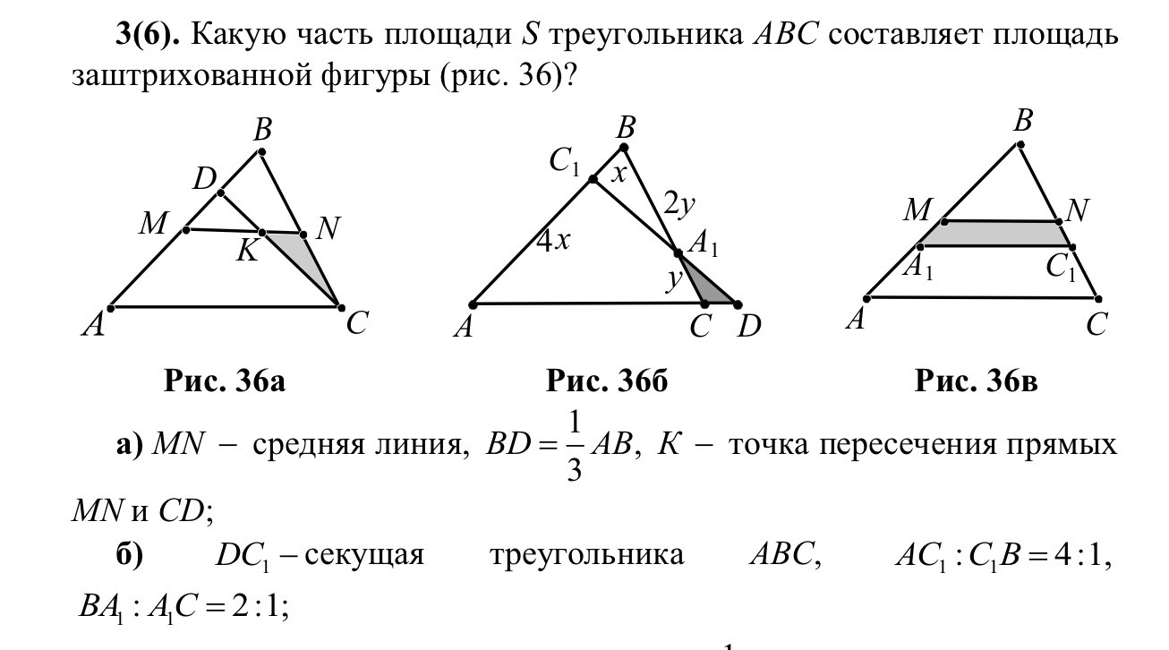 Площадь треугольника, отсекаемого средней линией, равна четверти площади исходного треугольника.
