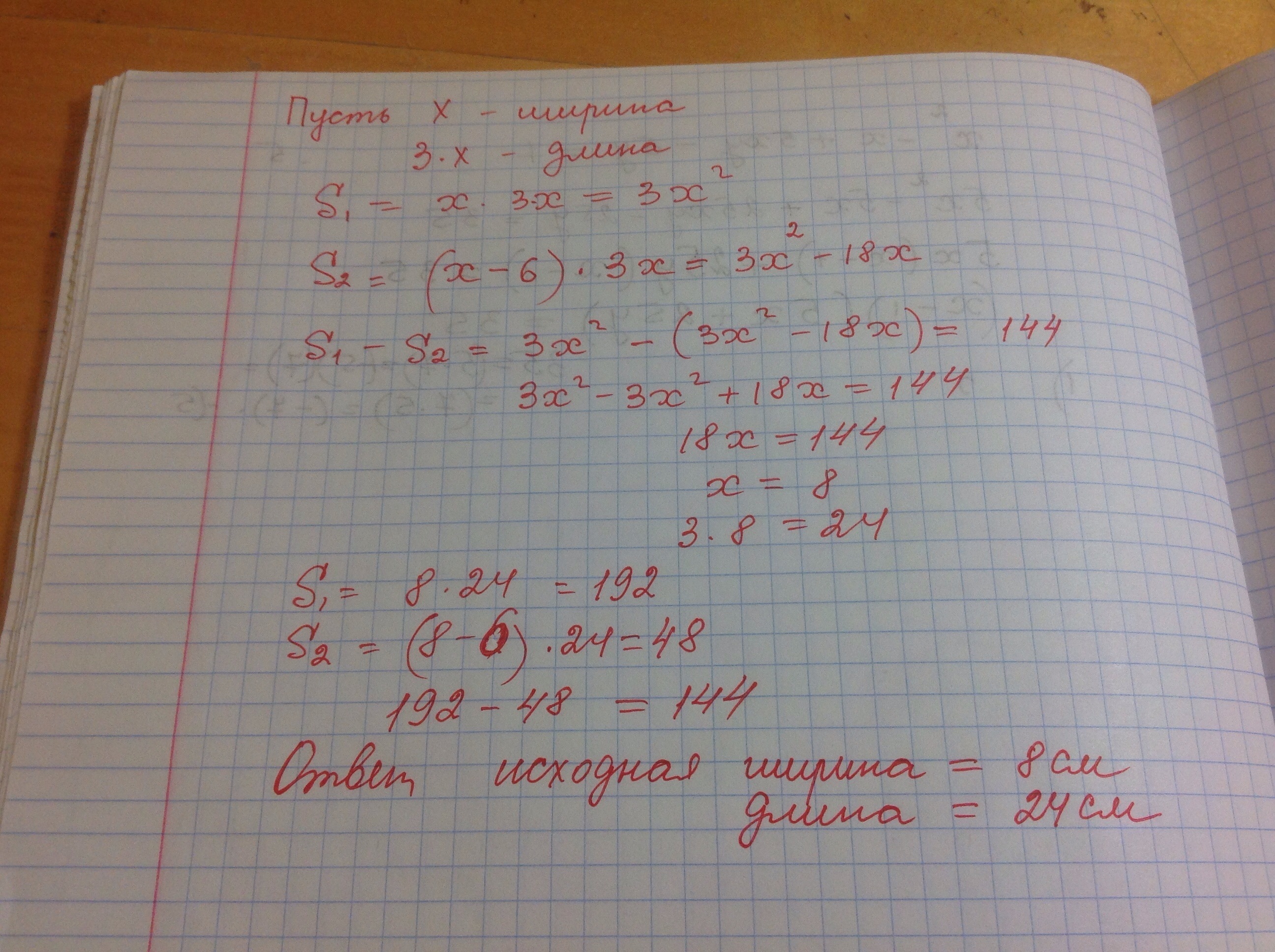 Длина прямоугольника в 3 раза больше его ширины если ширину прямоугольника уменьшить на 6 см то его площадь уменьшится на 144 квадратных сантиметра найдите исходную и ширину прямоугольника