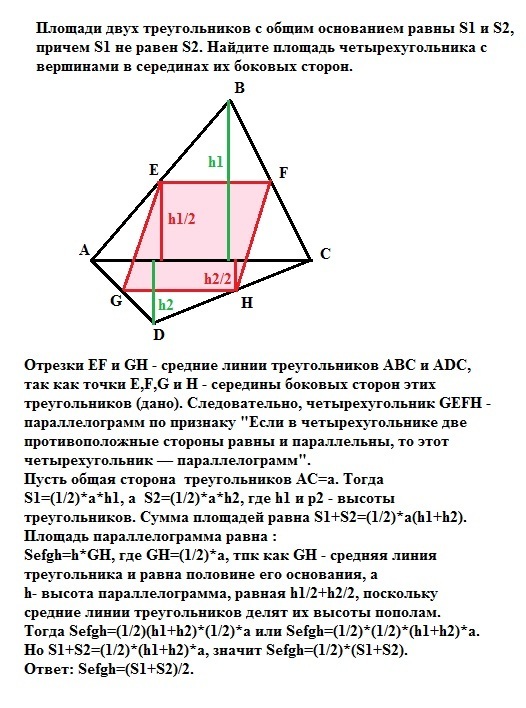 Площади двух треугольников с общим основанием равны S1 и S2, причем S1 не равен S2. Найдите площадь четырехугольника с вершинами в серединах их боковых сторон.
